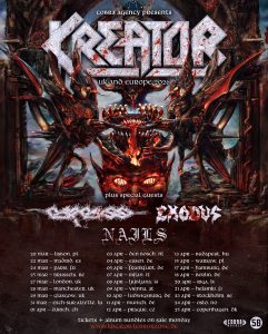 Petrozza a déclaré : « Nous sommes plus qu’enthousiastes à l’idée de démarrer la nouvelle année avec la sortie de notre tout nouvel album « Krushers Of The World », qui sortira le 16 janvier. Mais ce n’est pas tout ! Le 20 mars, nous prendrons la route pour vous présenter notre plus grande tournée jamais organisée. Ce sera une soirée de metal déchaîné, avec nos frères d’armes CARCASS, EXODUS et les puissants NAILS. Cela marque un nouveau chapitre passionnant pour le groupe, et nous sommes impatients de vous faire découvrir nos nouveaux morceaux en live, ainsi qu’une sélection de classiques de KREATOR, anciens et nouveaux. Salut à vous tous ! \m/ ».